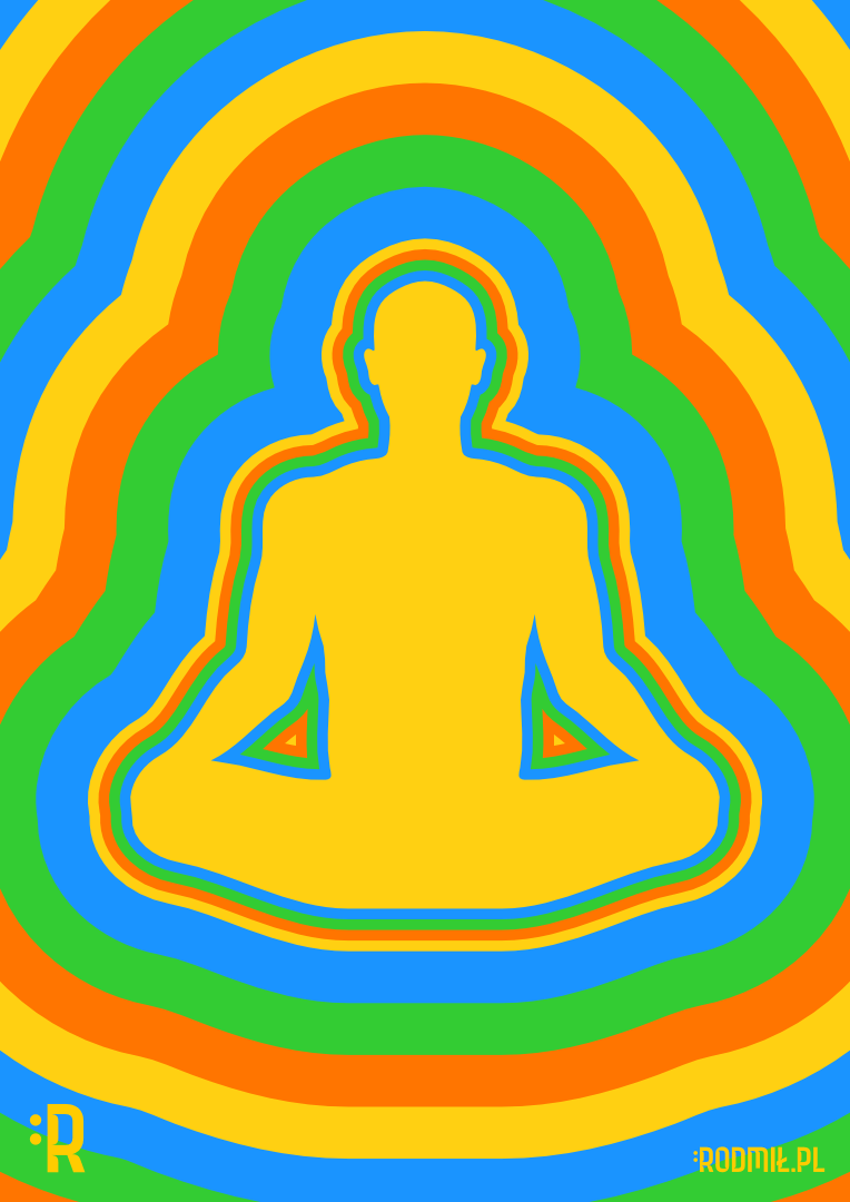 Projekt graficzny plakatu AURA. Postać nagiego mężczyzny siedzącego w pozycji medytacyjnej z rozchodzącymi się wokół niego kolorowymi falami energii.