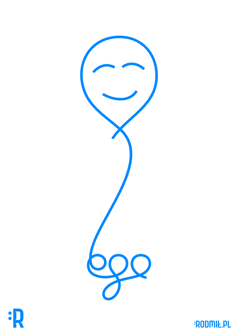 Projekt graficzny plakatu EGO. Biało-niebieski balonik z zadowoloną miną i słowem ego ułożonym z tasiemki, na której się trzyma.