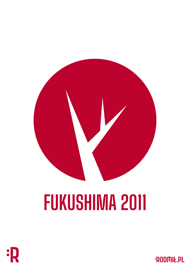Projekt graficzny plakatu FUKUSHIMA 2011. Czerwone koło z flagi Japonii popękane od dołu w formie pnia i gałęzi wiśniowego drzewa.