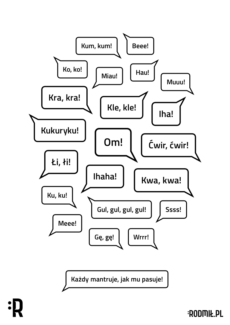 Projekt graficzny plakatu KAŻDY MANTRUJE JAK MU PASUJE. Zgrupowane czarno-białe dymki tekstowe z fonetycznymi odgłosami wielu zwierząt.