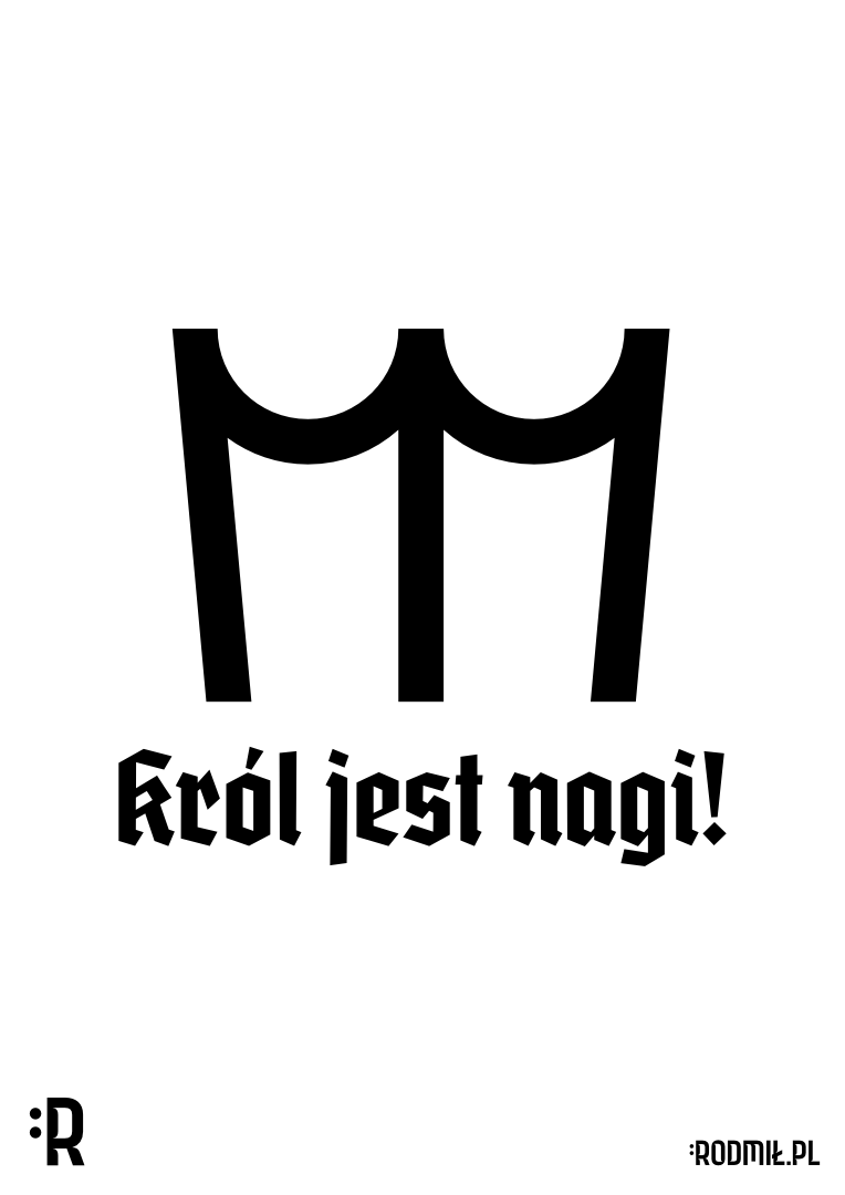 Projekt graficzny plakatu KRÓL JEST NAGI. Czarno-biała korona w kształcie nagich pośladków z fragmentem nóg.