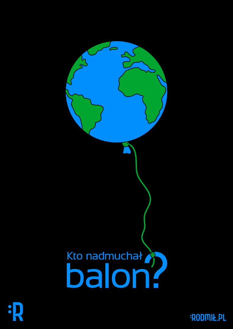 Projekt graficzny plakatu KTO NADMUCHAŁ BALON? Niebiesko-zielona kula ziemska w formie balonika na sznurku.