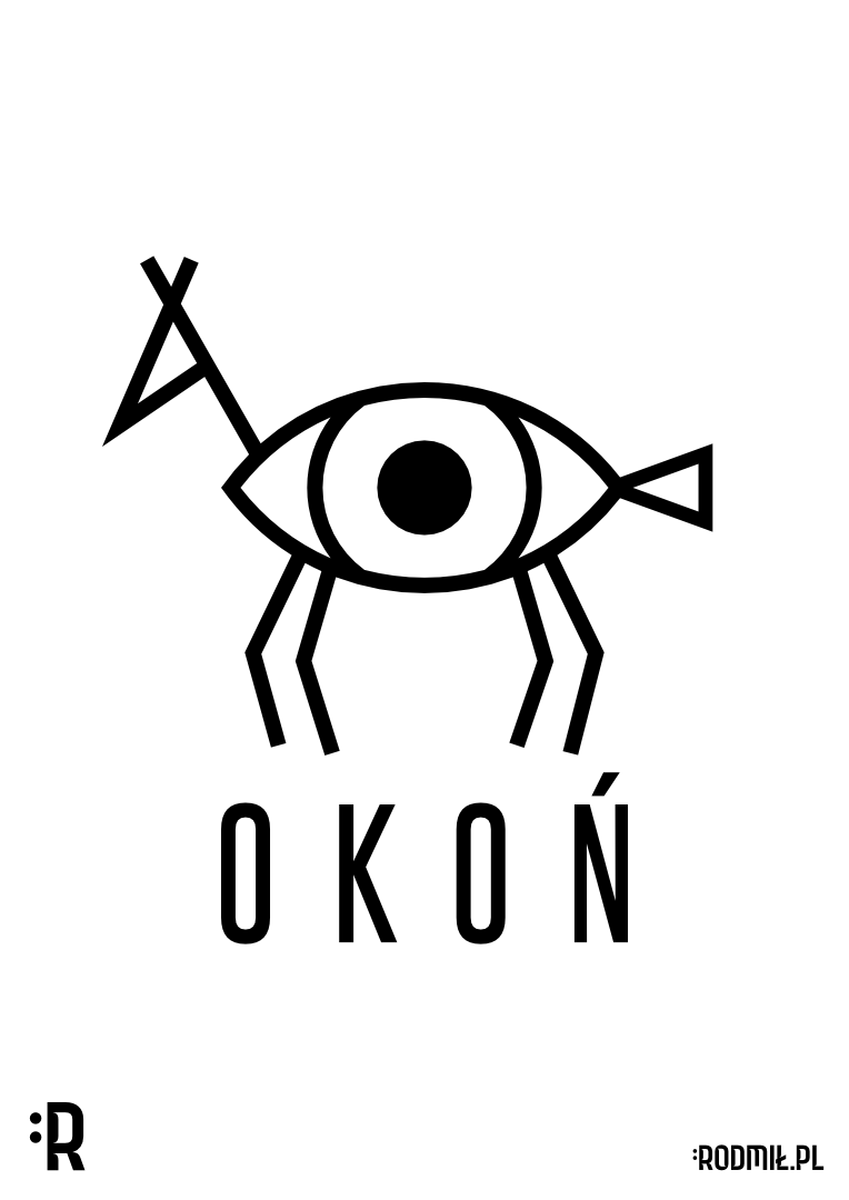 Projekt graficzny plakatu OKOŃ. Minimalistyczna czarno-biała postać konia, którego tułów ma kształt oka i jednocześnie ryby.