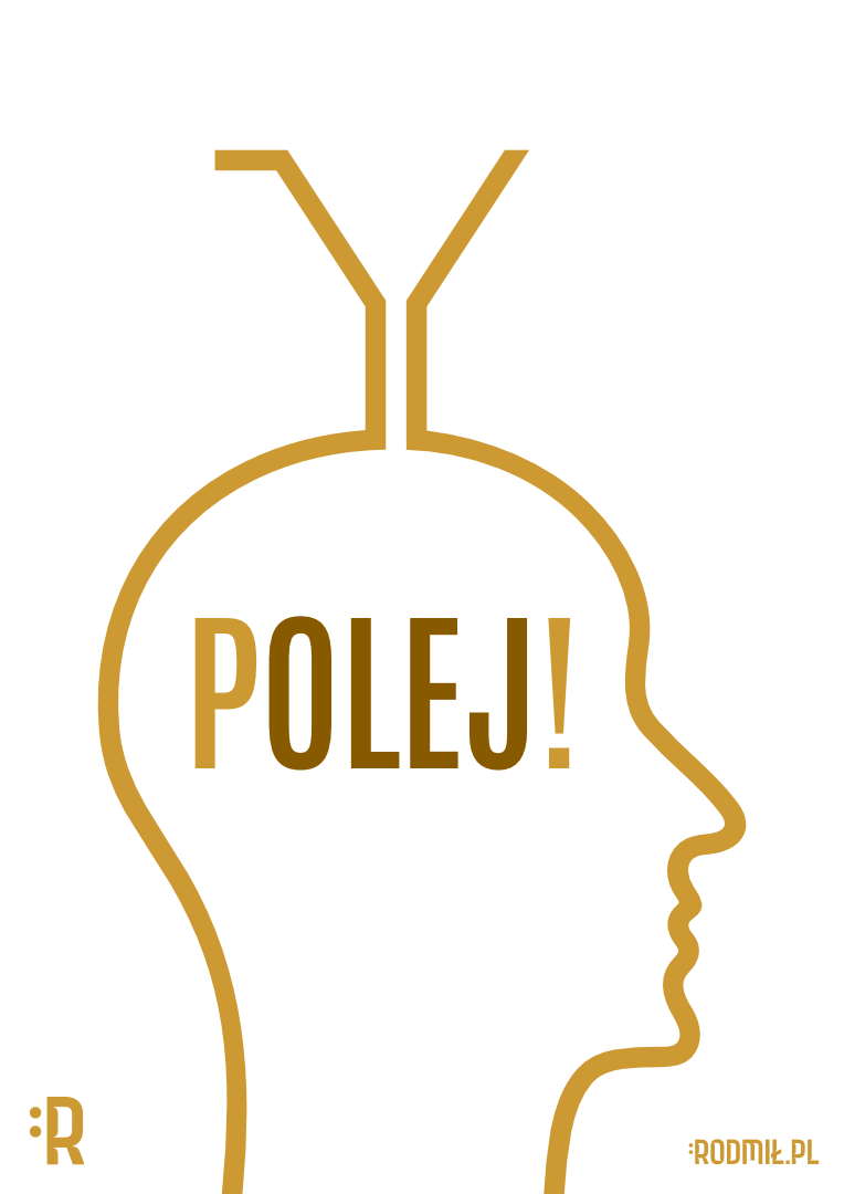 Projekt graficzny plakatu POLEJ! Uproszczony liniowy jasnobrązowy kształt głowy mężczyzny z profilu z lejkiem na głowie.