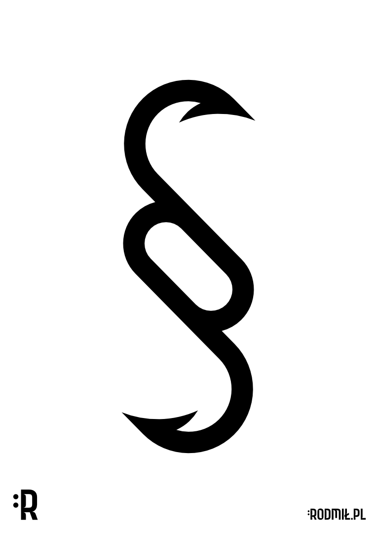 Projekt graficzny plakatu PRAWO MORSKIE. Czarny znak paragrafu na białym tle, którego zakończenia wyglądają jak haczyki na ryby.
