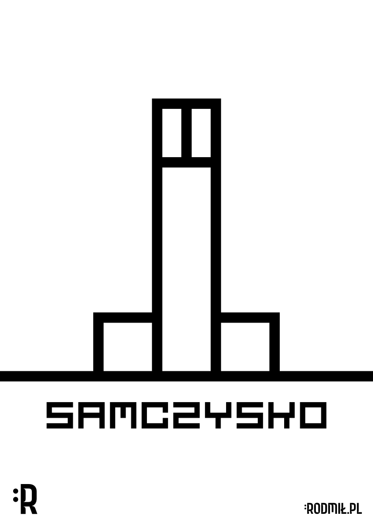Projekt graficzny plakatu SAMCZYSKO. Czarny uproszczony kwadratowy liniowy kształt penisa z jądrami przypominający budynek zamek.
