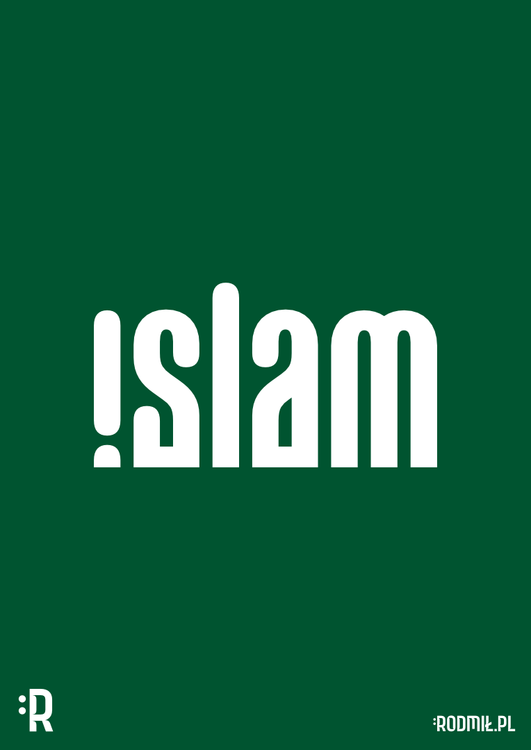 Projekt graficzny plakatu !SLAM. Biały napis ISLAM na zielonym tle z odwróconą literą "i" jako wykrzyknikiem, dającym angielski napis SLAM. Typografia.
