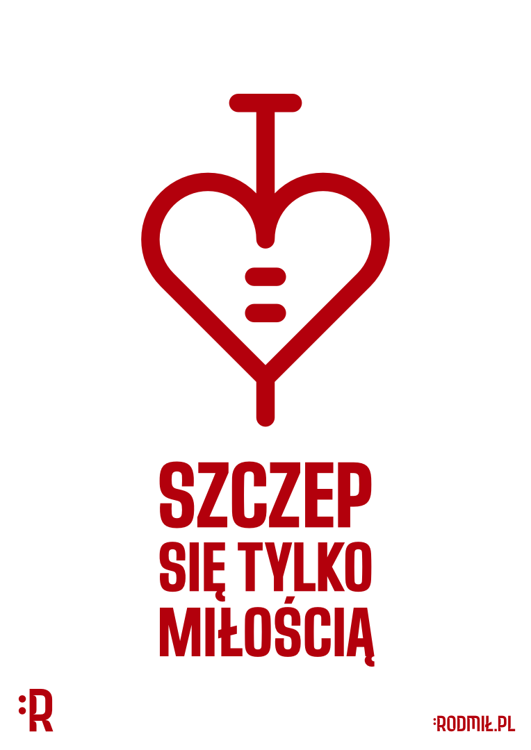Projekt graficzny plakatu SZCZEP SIĘ TYLKO MIŁOŚCIĄ. Minimalistyczna czerwono-biała strzykawka lekarska w kształcie serca.