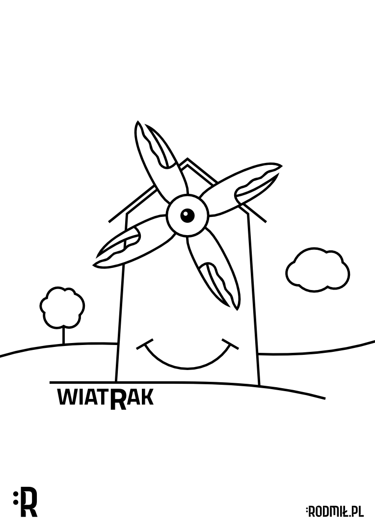 Projekt graficzny plakatu WIATRAK. Liniowy czarno-biały kształt wiatraka z łopatami ze szczypiec raka z okiem pośrodku i uśmiechem poniżej.
