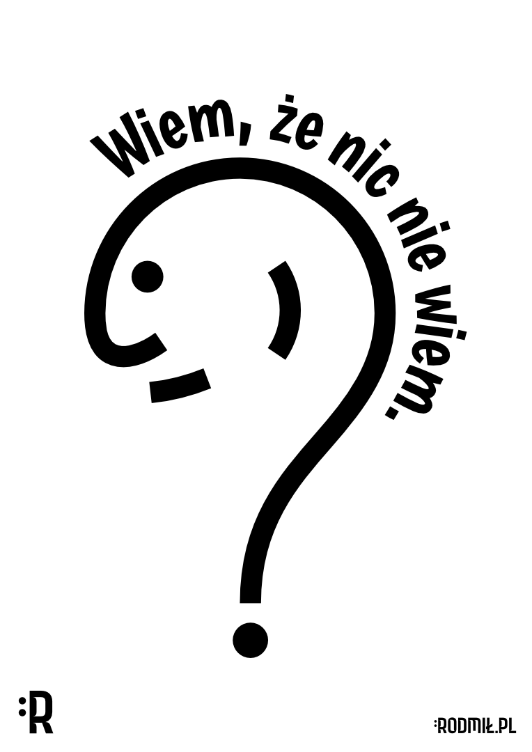 Projekt graficzny plakatu WIEM, ŻE NIC NIE WIEM. Uproszczony liniowy czarny kształt głowy mężczyzny z profilu w formie uśmiechniętego pytajnika. Typografia.