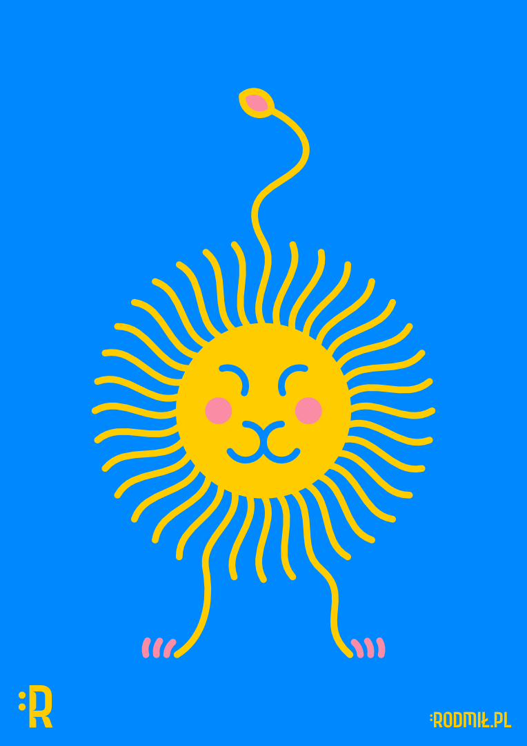 Projekt plakatu MOJEMU SŁOŃCU. Żółty minimalistyczny liniowy kształt uśmiechniętego lwa na niebieskim tle z rozłożystą grzywą w formie słońca.
